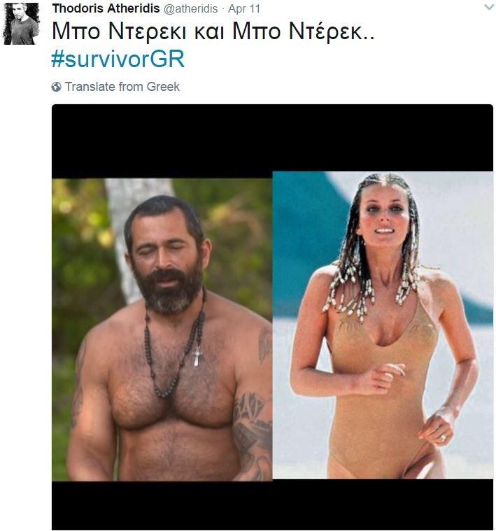 Το σχόλιο του ήταν τόσο εύστοχο, που οι ακόλουθοί του έσπευσαν να κάνουν retweet τη συγκεκριμένη ανάρτηση. Ο Θοδωρής Αθερίδης δημοσίευσε ένα κολάζ του Μπο και της Μπο Ντέρεκ και έγραψε «Bo Ντερέκι και Μπο Ντέρεκ».