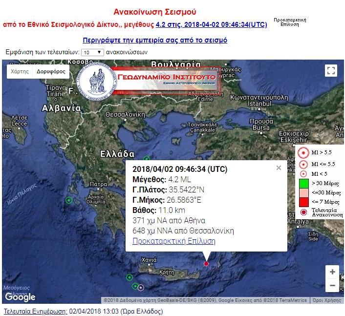 Σεισμική δόνηση μεγέθους 4,2 βαθμών της κλίμακας Ρίχτερ σημειώθηκε ανοιχτά της Κάσου, το μεσημέρι της Δευτέρας.