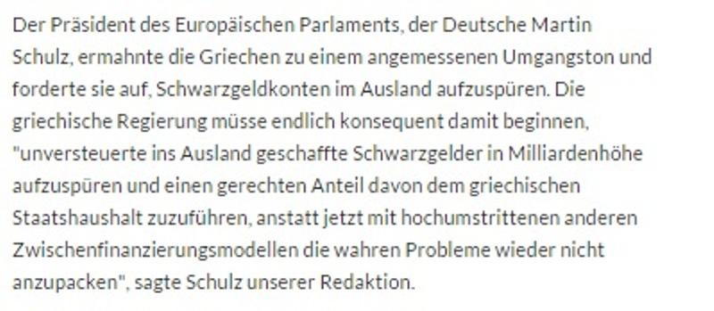 Ο πρόεδρος του Ευρωπαϊκού Κοινοβουλίου Μάρτιν Σουλτς, μιλώντας στη γερμανική εφημερίδα  Rheinische Post κάλεσε την ελληνική κυβέρνηση να ασχοληθεί με το «μαύρο» χρήμα που βρίσκεται σε λογαριασμούς στο εξωτερικό.