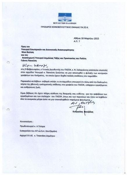 στις 9 Φεβρουαρίου, ο Γενικός Διευθυντής του ΠΑΣΟΚ, κ. Ν. Σαλαγιάννης απέστειλε επιστολή στον αρμόδιο Υπουργό κ. Πανούση ζητώντας να μην αποσυρθεί η φύλαξη των κεντρικών γραφείων του Κινήματος, τα οποία έχουν δεχθεί πολλές επιθέσεις στο παρελθόν.