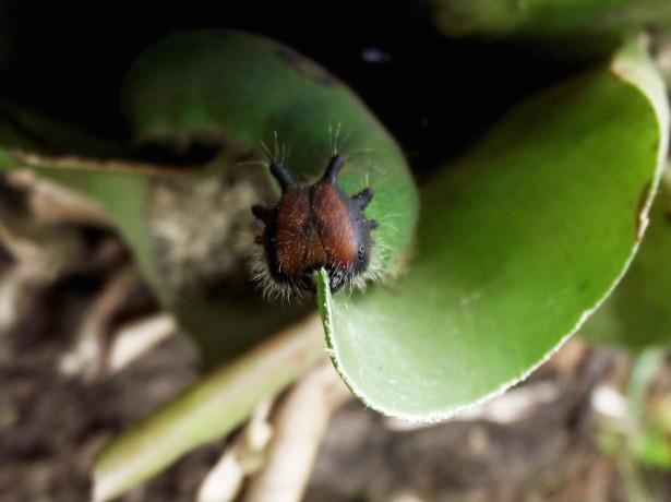 H κάμπια Dynastor darius darius δεν είναι μια συνηθισμένη κάμπια. Είναι χαρακτηριστικό το μεγάλο μαύρο κεφάλι στην άκρη του πράσινου σώματός της.