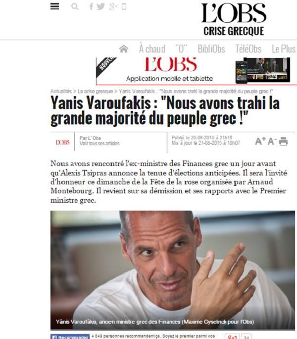Την στάση που θα κρατήσει στις επικείμενες εκλογές ξεκαθαρίζει ο πρώην υπουργός Οικονομικών Γιάνης Βαρουφάκης, σε συνέντευξη που παραχώρησε στο περιοδικό Nouvel Observateur, μία ημέρα πριν ο Αλέξης Τσίπρας ανακοινώσει την προκήρυξη των πρόωρων εκλογών.