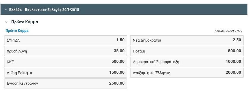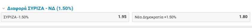 Με 1.50 απόδοση δίνει πρωτιά στον ΣΥΡΙΖΑ η εταιρεία Stoiximan, ενώ δίνει απόδοση 2.50 στην νίκη της ΝΔ.