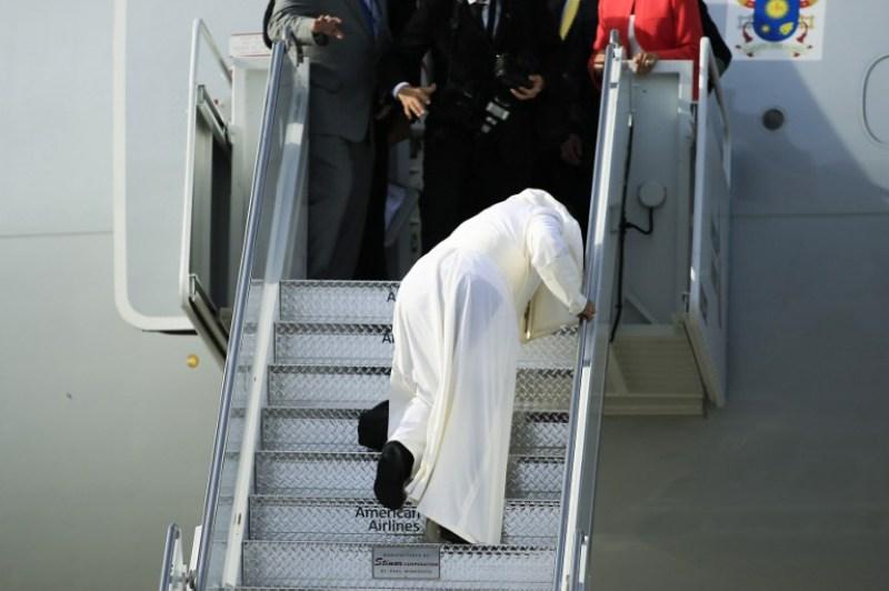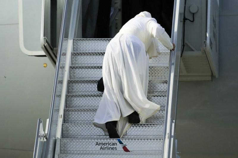 Οι φωτογραφίες που δείχνουν τον Πάπα Φραγκίσκο να “σέρνεται” στις σκάλες του αεροπλάνου προκειμένου να ταξιδέψει στην Φιλαδέλφεια, νέο σταθμό του ταξιδιού του στις ΗΠΑ, κάνουν το γύρο του κόσμου και πυροδότησαν σενάρια σχετικά με την υγεία του Ποντίφικα.