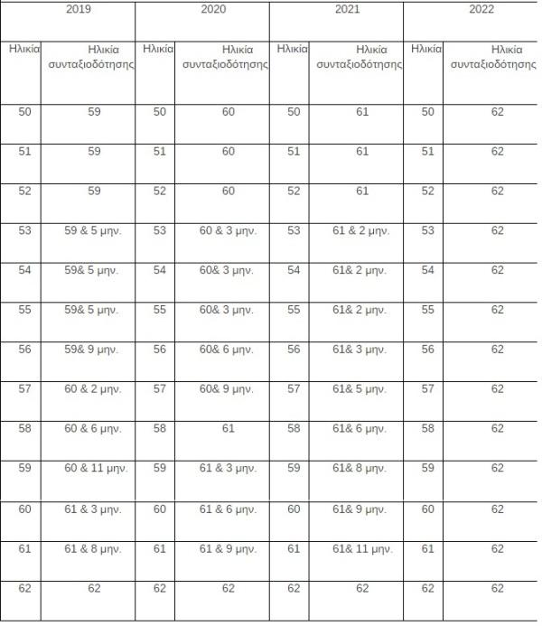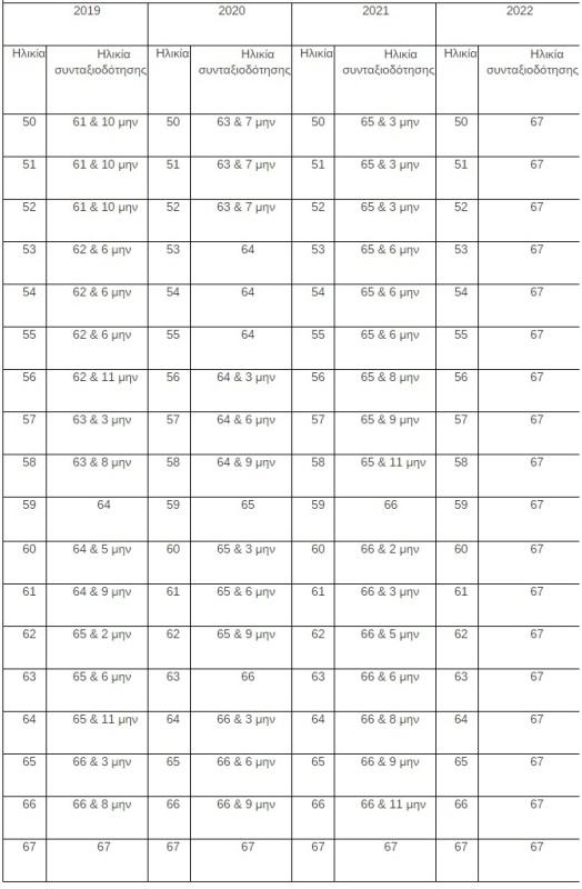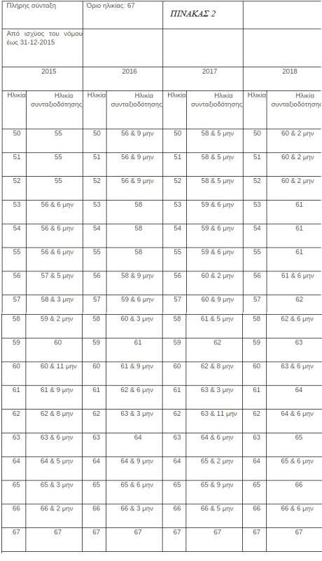 Στη στήλη «Ηλικία» αποτυπώνεται το ισχύον κατά την 18/8/2015 όριο ηλικίας συνταξιοδότησης, ενώ στη στήλη «Ηλικία συνταξιοδότησης» αποτυπώνεται το ισχύον κατά περίπτωση από 19/8/2015 μέχρι και την 1/1/2022 νέο όριο ηλικίας καταβολής της σύνταξης.