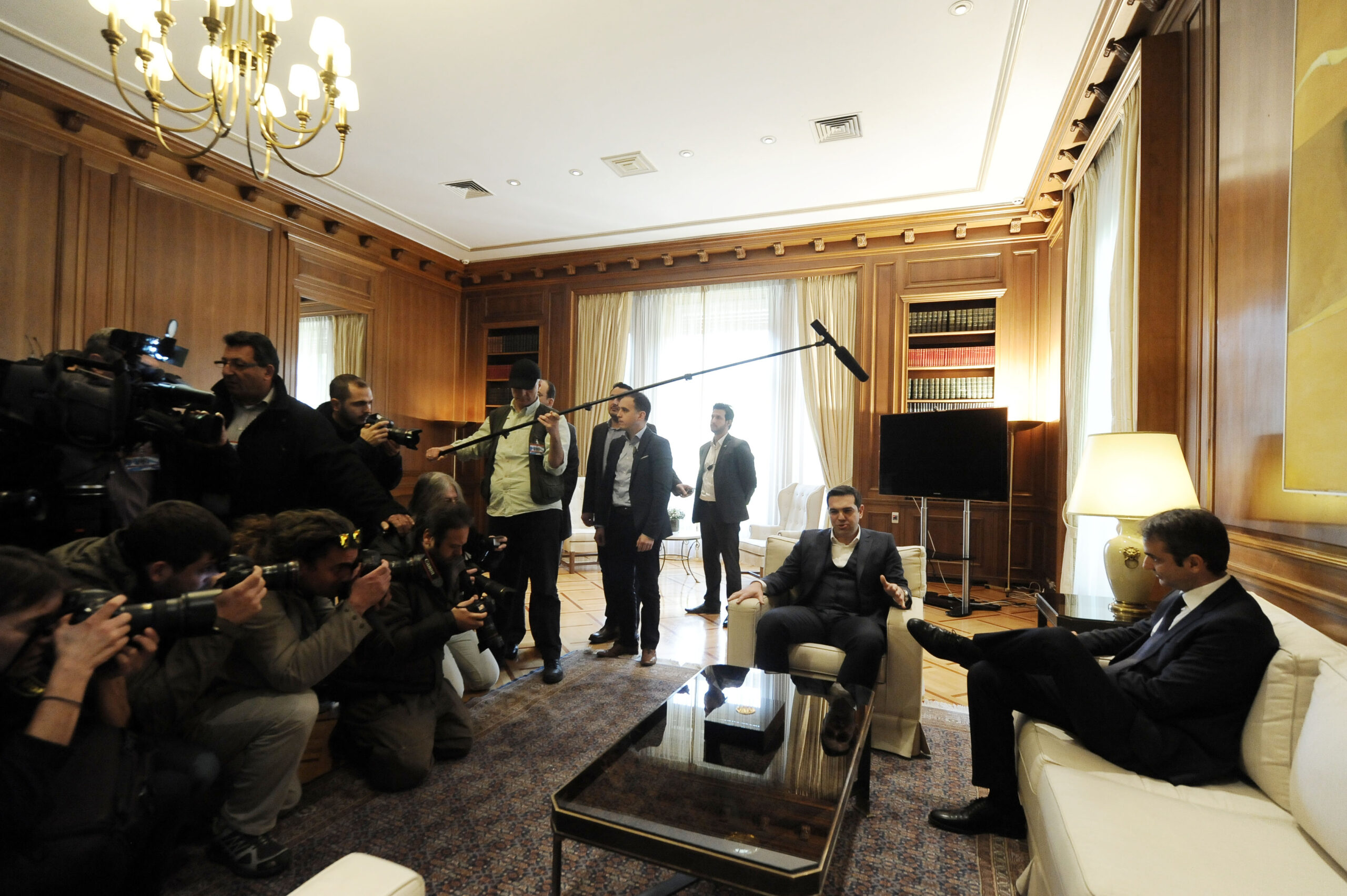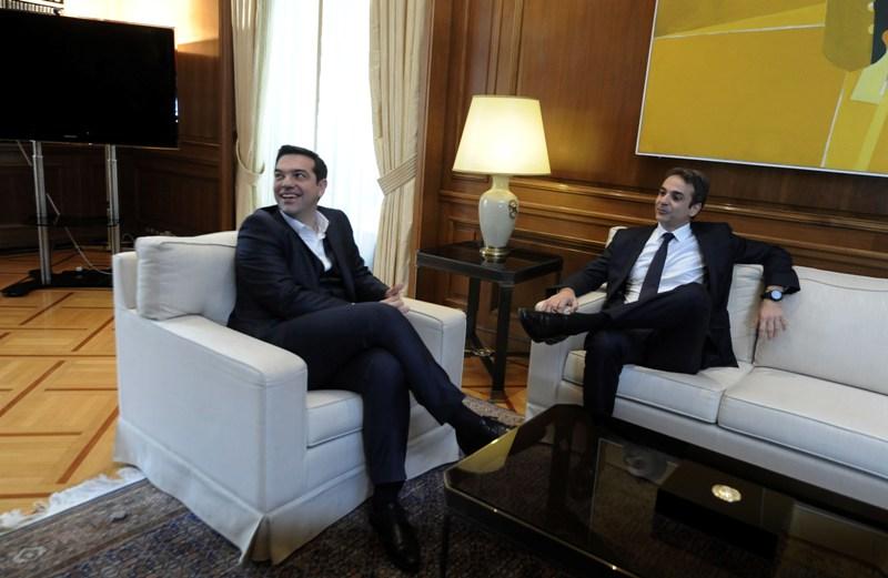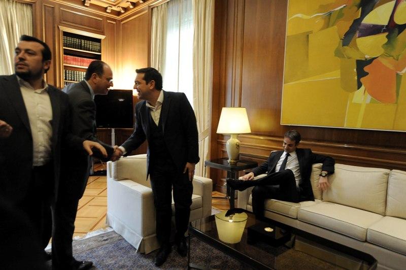 Πλήθος δημοσιογράφων και φωτορεπόρτερ ανέμεναν την συνάντηση του πρωθυπουργού με τον νέο πρόεδρο της Νέας Δημοκρατίας Κυριάκο Μητσοτάκη, στη Μέγαρο Μαξίμου.