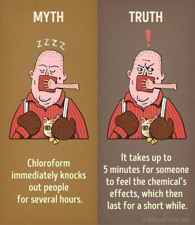 Το Χλωροφόρμιο μπορεί να κοιμίσει άμεσα έναν άνθρωπο, επομένως όταν χρησιμοποιείται στις ταινίες βλέπουμε τον χαρακτήρα να χάνει άμεσα τις αισθήσεις του. Στην πραγματικότητα, το Χλωροφόρμιο χρειάζεται περίπου 5′ λεπτά για να δράσει, πράγμα που δίνει στον άνθρωπο την πιθανότητα αντίδρασης.