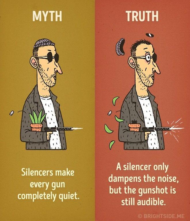 Οι σιγαστήρες κάνουν τα όπλα αθόρυβα. Στην πραγματικότητα οι σιγαστήρες μειώνουν τον θόρυβο που κάνουν τα όπλα, αλλά δεν τον εξαφανίζουν, με αποτέλεσμα ο πυροβολισμός να παραμένει αισθητός.