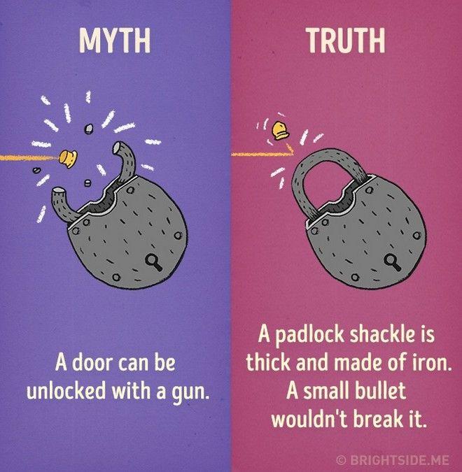 Μια κλειδωμένη πόρτα μπορεί να ανοίξει πυροβολώντας την κλειδαριά. Στην πραγματικότητα τα πράγματα δεν είναι ακριβώς έτσι, αφού μια μικρή σφαίρα δεν μπορεί να σπάσει μια ατσαλένια κλειδαριά.