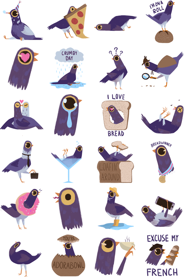 Ωστόσο, δεν είναι μόνο ένα emoticon αφού πρόκειται για sticker πακέτο με το μωβ πουλί να τρώει ψωμί, πίτσα, donuts.