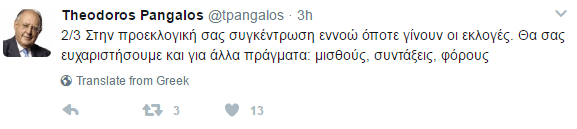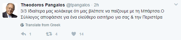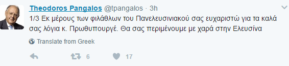 «Εκ μέρους των φιλάθλων του Πανελευσινιακού σας ευχαριστώ για τα καλά σας λόγια κ. Πρωθυπουργέ. Θα σας περιμένουμε με χαρά στην Ελευσίνα. Την προεκλογική σας συγκέντρωση εννοώ όποτε γίνουν οι εκλογές. Θα σας ευχαριστήσουμε και για άλλα πράγματα: μισθούς, συντάξεις, φόρους. Ιδιαίτερα μας κολάκεψε ότι μας βλέπετε να παίζουμε με τη Μπάρτσα. Ο Σύλλογος αποφάσισε για ένα ελεύθερο εισιτήριο για σας και την Περιστέρα» έγραψε ο κ. Πάγκαλος.