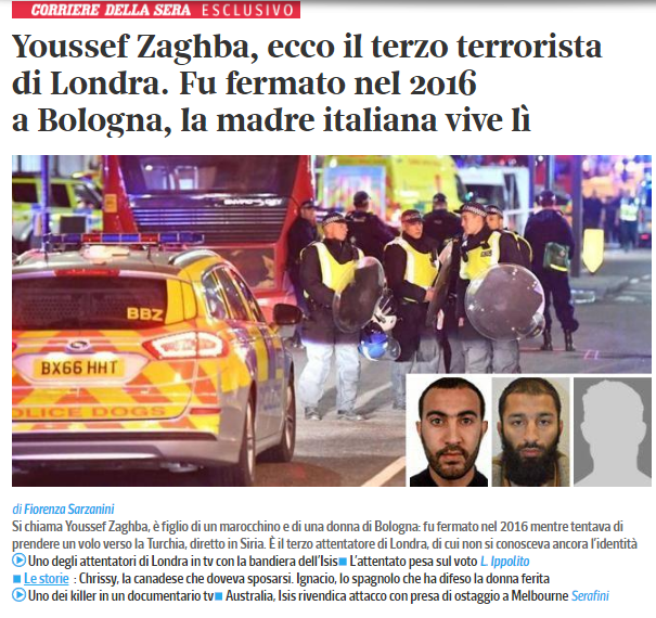 Το 2016, οι ιταλικές αρχές εμπόδισαν τον Γιούσεφ Ζάγμπα να ταξιδέψει στην Συρία και ειδοποίησαν για τις κινήσεις του τις βρετανικές αρχές, σύμφωνα με το δημοσίευμα της εφημερίδας.Οπως αναφέρει η εφημερίδα στο κείμενό της η μητέρα του φερόμενου ως δράστη ζει στη Μπολόνια ακόμα και σήμερα.