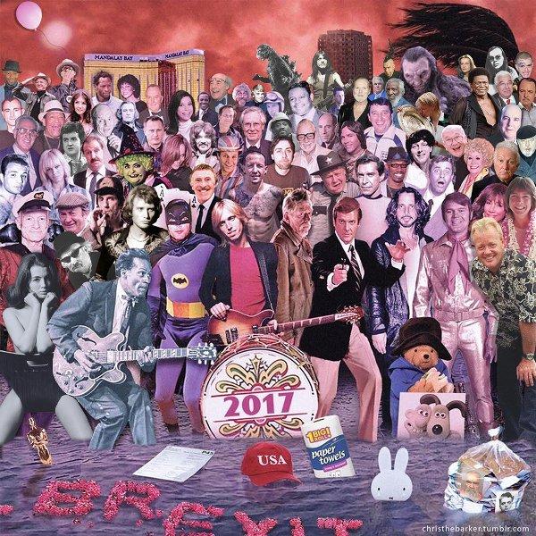 Από τον Τσακ Μπέρι, τον Ρότζερ Μουρ και τον Τομ Πέτι, ως τον Μάικλ Μποντ (ο οποίος εκπροσωπείται στην αφίσα από το πιο γνωστό δημιούργημά του, τον αρκούδο Πάντινγκτον), τον ιδρυτή του Playboy, Χιου Χέφνερ και δεκάδες άλλους, όλοι οι άνθρωποι της τέχνης και των media που πέθαναν μέσα στο 2017 είναι «παρόντες» στην συγκινητική αφίσα.