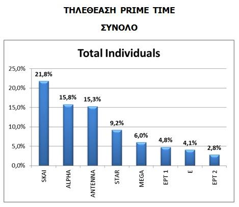 Σύμφωνα με τα στοιχεία της Nielsen, ο ΣΚΑΪ ήταν πρώτος τόσο στο σύνολο του κοινού, όσο και στις ηλικίες 15-44. Εντυπωσιακή ήταν και η πρωτιά στο prime time, τόσο στο σύνολο του κοινού, όσο και στις ηλικίες 15-44.