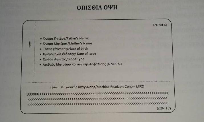 • Ζώνη 6: Όνομα Πατέρα, Όνομα Μητέρας, Τόπος γέννησης, Ημερομηνία έκδοσης, Ομάδα Αίματος, Αριθμός Μητρώου Κοινωνικής Ασφάλισης (Α.Μ.Κ.Α.), ψηφιακό δακτυλικό αποτύπωμα