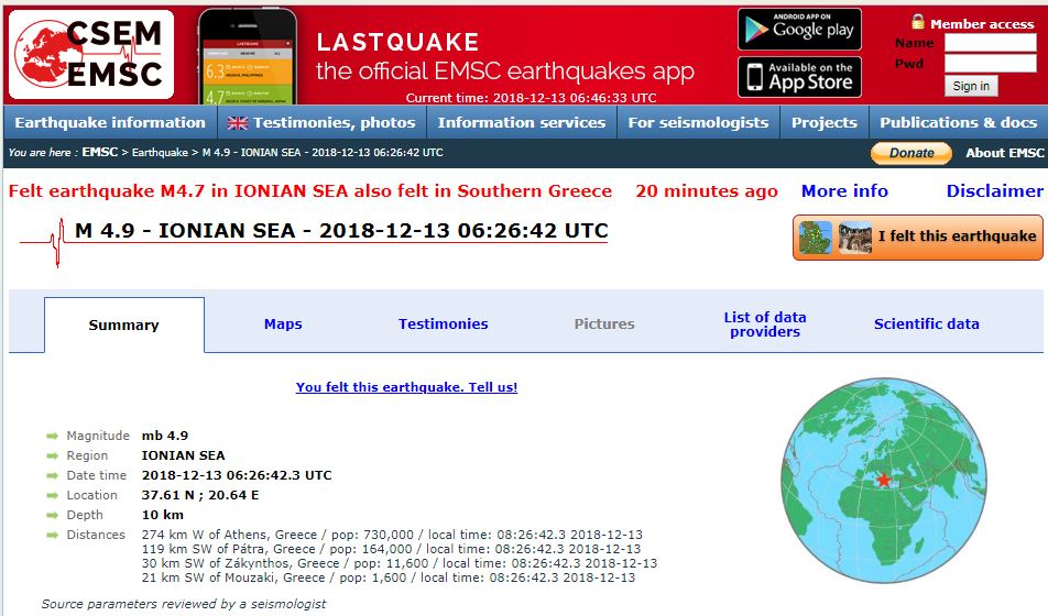 Το επίκεντρο εντοπίστηκε 25 χλμ. νοτιοδυτικά της Ζακύνθου, ενώ το εστιακό βάθος υπολογίστηκε στα 10 χλμ.