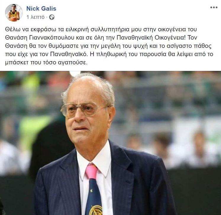 “Θέλω να εκφράσω τα ειλικρινή συλλυπητήρια μου στην οικογένεια του Θανάση Γιαννακόπουλου και σε όλη την Παναθηναϊκή Οικογένεια! Τον Θανάση θα τον θυμόμαστε για την μεγάλη του ψυχή και το ασίγαστο πάθος που είχε για τον Παναθηναϊκό. Η πληθωρική του παρουσία θα λείψει από το μπάσκετ που τόσο αγαπούσε”, έγραψε εμφανώς συγκινημένος ο Νίκος Γκάλης.