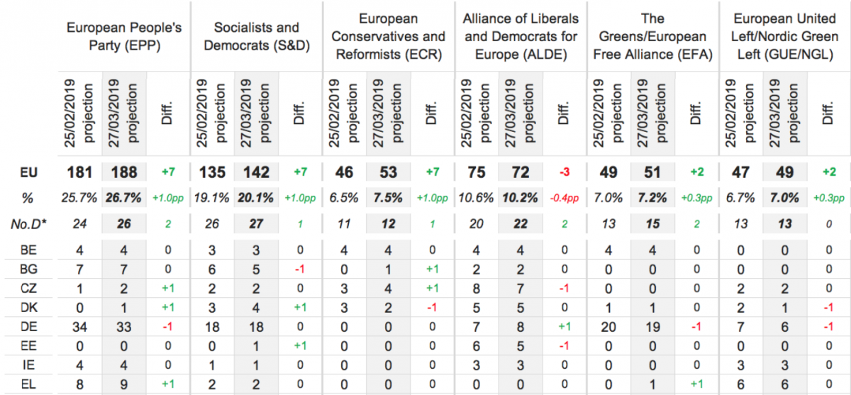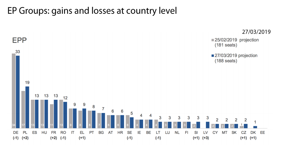 Το Ευρωπαϊκό Λαϊκό Κόμμα φαίνεται μάλιστα ότι αυξάνει τις έδρες του, σε σχέση με την προηγούμενη δημοσκόπηση, εξασφαλίζοντας 188 θέσεις, δηλαδή το 26,7% των 705 συνολικά θέσεων του Ευρωκοινοβουλίου.