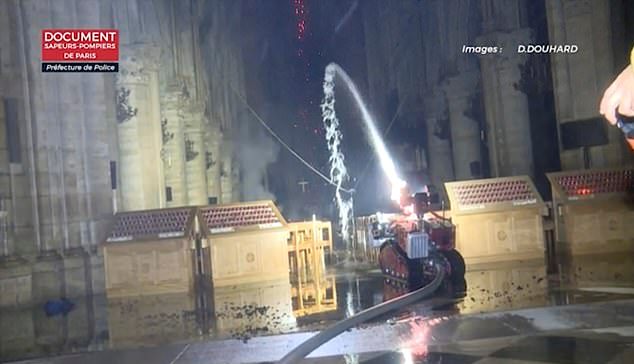 Το όχημα που μοιάζει με μικρή κόκκινη μπουλντόζα, είναι πυρίμαχο, αδιαπέραστο από νερό και ήταν εκείνο που στάλθηκε από τους πυροσβέστες μέσα στον φλεγόμενο ναό, για να πολεμήσει τη φωτιά εκ των έσω, ρίχνοντας νερό και επιβραδυντικό.