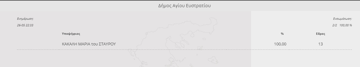 Και όμως υπάρχει περιοχή όπου ο δήμαρχος εξελέγη με το 100% των ψήφων. Δηλαδή όλοι οι κάτοικοι ψήφισαν μονοκούκι το ίδιο πρόσωπο. Η περιοχή αυτή είναι ο Άγιος Ευστράτιος και η δήμαρχος που εξελέγη με το συντριπτικό ποσοστό είναι η Μαρία Κακαλή.