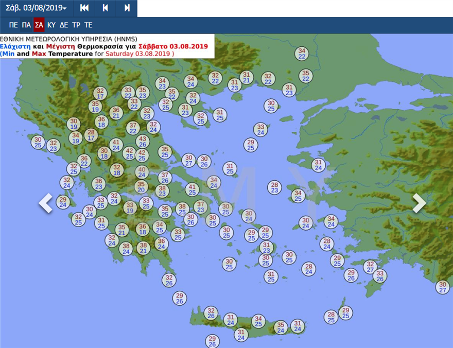 Θερμοκρασία: Από 20 έως 37 βαθμούς Κελσίου. Στη δυτική Μακεδονία 2 με 3 βαθμούς χαμηλότερη.