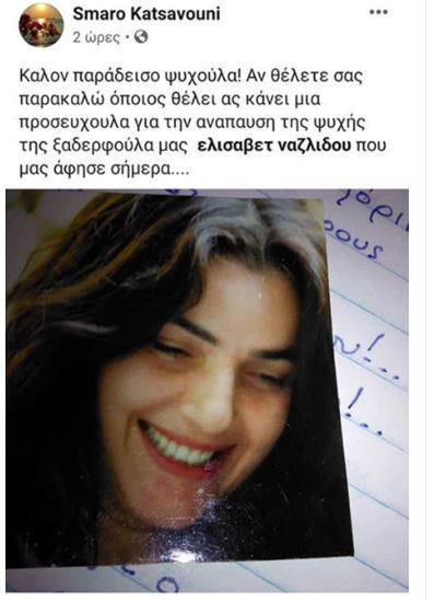 Έφυγε από τη ζωή η γνωστή ηθοποιός Ελισάβετ Ναζλίδου έπειτα από σκληρή μάχη που έδινε με τον καρκίνο. Το θλιβερό γεγονός έκανε γνωστό με ανάρτησή της στο Facebook, η ξαδέλφη της Σμαρώ Κατσαβούνη, η οποία την αποχαιρέτησε με μία συγκινητική ανάρτηση.