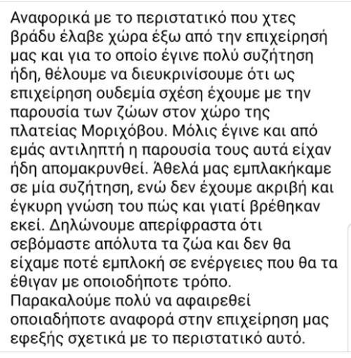 Σε νέα ερώτηση της Voria.gr προς τον ιδιοκτήτη για το εάν επιτρέπεται να βάζουν τα τετράποδα σε κλουβιά έξω από το μαγαζί, οι ίδιοι είπαν «θα σου απαντήσουμε αντίστροφα, απαγορεύεται;».