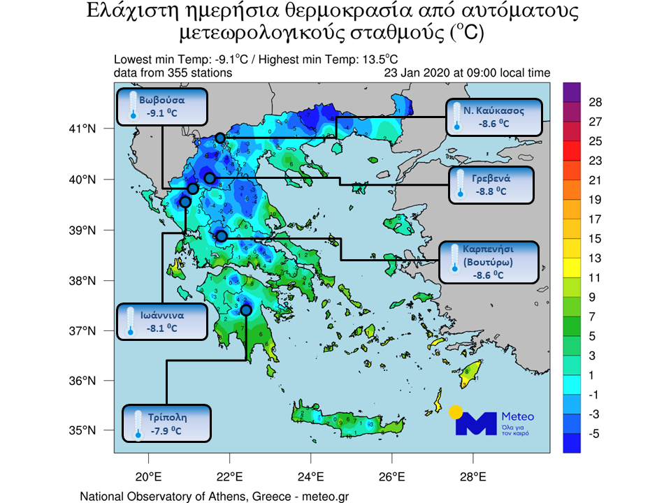 Οι ελάχιστες θερμοκρασίες όπως κατεγράφησαν από το δίκτυο αυτόματων μετεωρολογικών σταθμών του Εθνικού Αστεροσκοπείου Αθηνών / meteo.gr, καθώς επίσης και οι έξι χαμηλότερες ελάχιστες θερμοκρασίες, παρουσιάζονται στο χάρτη που ακολουθεί.