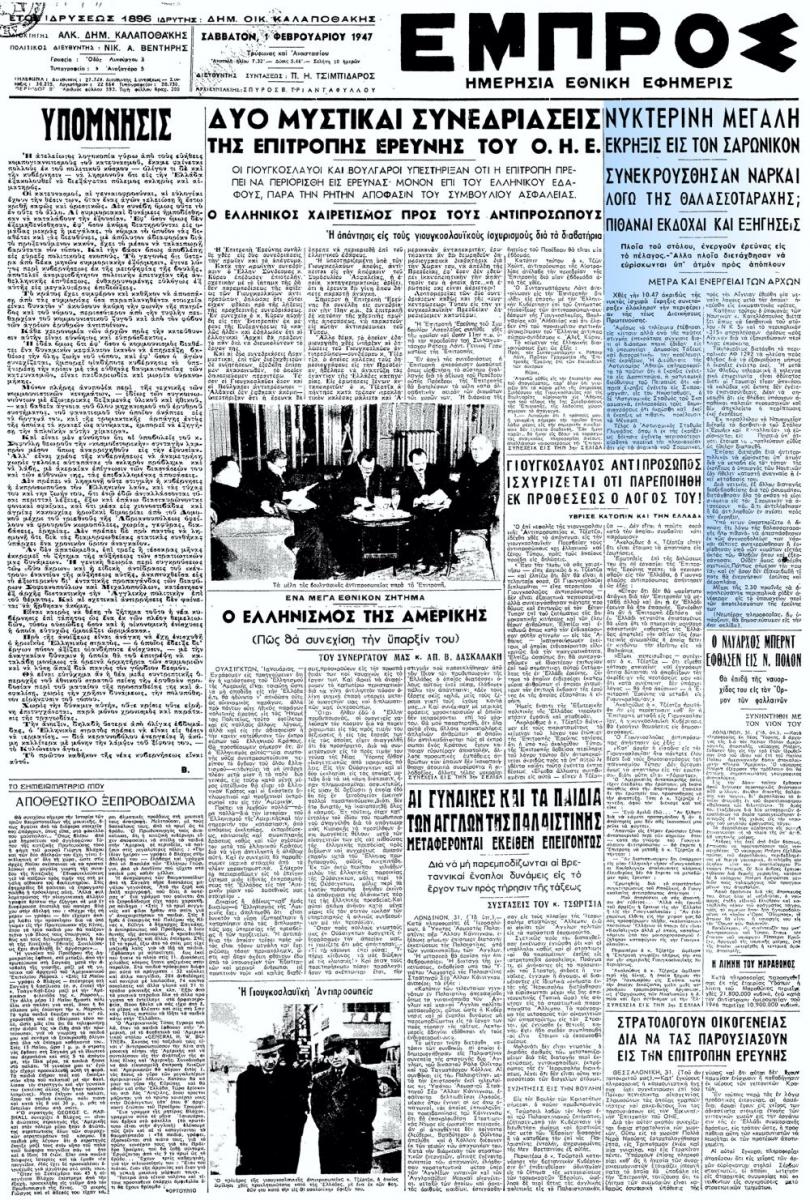 Η είδηση αυτή δημοσιεύθηκε σε μία σειρά από άρθρα στην εφημερίδα “ΕΜΠΡΟΣ”, από την 01/02/1947 μέχρι τις 04/02/1947