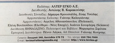 Εντυπωσιακή η αναβάθμιση της Μαργαρίτας Σφέτσα που -αν και στο τέλος της «ταυτότητας»- εμφανίζεται ως έχουσα την «Διεύθυνση ΒΗΜΑgazino, Πολιτισμού και Βιβλίων».