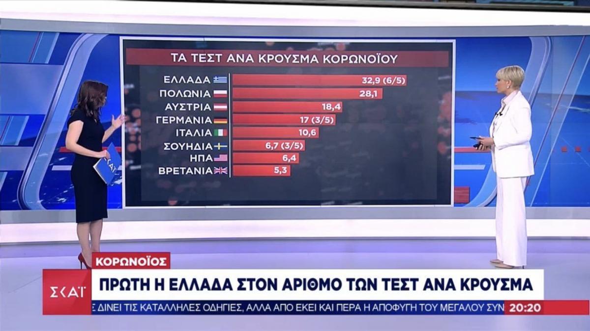 Με έναν… μαγειρεμένο πίνακα στατιστικών στοιχείων όσον αφορά την εικόνα της Ελλάδας σε σχέση με τις άλλες χώρες του κόσμου στο θέμα των τεστ κορωνοϊού, επιχείρησε η τηλεόραση του ΣΚΑΪ να στηρίξει το έργο της κυβέρνησης. Παρουσίασε στοιχεία με βάση τα τεστ ανά κρούσμα, όπου εμφανώς η Ελλάδα υπολείπεται πολύ έναντι άλλων χωρών, με αποτέλεσμα να ανεβαίνει στα… ύψη το τελικό ποσοστό και η χώρα μας να ξεπερνά χώρες όπως η Γερμανία ή η Ιταλία, αλλά και οι ΗΠΑ ή η Βρετανία.