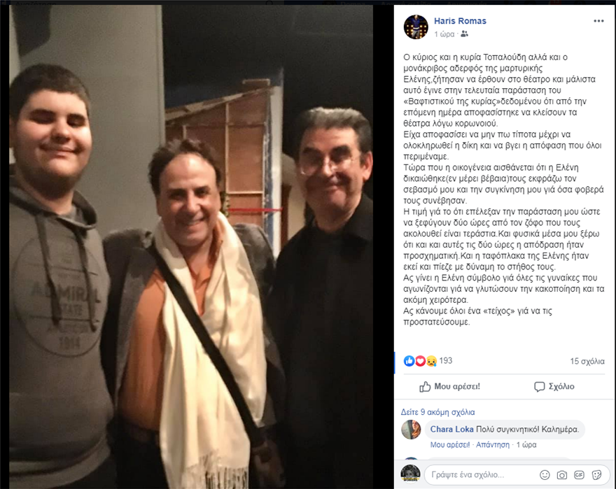 Με μία ανάρτησή του στο Facebook ο Χάρης Ρώμας εξέφρασε τον σεβασμό και τη συγκίνησή του στην οικογένεια της Ελένης Τοπαλούδη για «όσα φοβερά τους συνέβησαν» αποκαλύπτοντας ότι παρακολούθησαν την τελευταία παράσταση –πριν απαγορευτεί η λειτουργία των θεάτρων λόγω της πανδημίας- της κωμωδίας «Ο βαφτιστικός της κυρίας» στον Πολυχώρο «Αθηναΐς», για να «ξεφύγουν από το ζόφο που τους ακολουθεί».