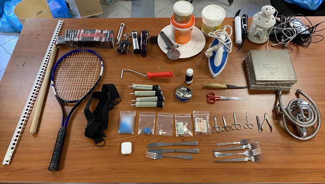 Βρέθηκε ακόμα, σε μία από τις πτέρυγες, μεγάλος αριθμός ειδών, για τα οποία διενεργείται πειθαρχική έρευνα σχετικά με την προέλευση και την εισαγωγή τους στο Κατάστημα Κράτησης όπως, ψυγεία και καταψύκτες, επιδαπέδιο κλιματιστικό, τηλεοράσεις, μπάρμπεκιου με κάρβουνα, ηλεκτρικές και ηλεκτρονικές συσκευές (ηλεκτρική κουζίνα, φούρνος μικροκυμάτων, κ.λπ.) οικιακός εξοπλισμός και είδη κουζίνας, γυάλινη πρόσοψη τζακιού, μπουκάλια με οινοπνευματώδη, δοχεία με συμπληρώματα εκγύμνασης κ.λπ. αντικείμενα.