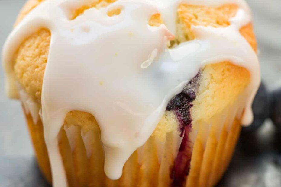Σε χαμηλή ταχύτητα προσθέστε το αλεύρι με το μπέϊκιν, αφού τα έχετε ανακατέψει καλά, σιγά – σιγά τμηματικά. Μην το παραχτυπήσετε γιατί θα σφίξει. Προσθέστε το χυμό λεμόνι και το ξύσμα και με τη σπάτουλα, διπλώστε στο μίγμα τα μύρτιλα. Γεμίστε τις θήκες μάφιν και ψήστε στους 200ο C για 20-22 λεπτά ή μέχρι η οδοντογλυφίδα που θα βυθίσετε να βγαίνει καθαρή. Αφήστε να κρυώσουν και ετοιμάστε το γλάσο.