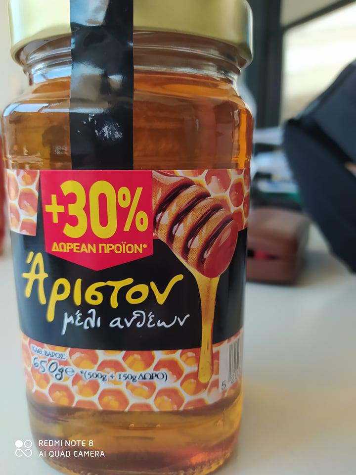 (γ) Μέλι ανθέων, εμπορικής ονομασίας «Άριστον μέλι Ανθέων», καθαρού βάρους 650g, με αριθμό παρτίδας LΟΤ 200430-1 και ημερομηνία λήξης 30/04/2022. Το ανωτέρω προϊόν συσκευάζεται για την επιχείρηση «ΝΤΙΜΦΙΛ Α.Ε.», από την επιχείρηση «ΜΕΛΙΝΤΑ Ε.Π.Ε.» ενώ ελήφθη από το υποκατάστημα της επιχείρησης «ΕΛΛΗΝΙΚΕΣ ΥΠΕΡΑΓΟΡΕΣ ΣΚΛΑΒΕΝΙΤΗΣ Α.Ε.Ε.», Ευριπίδου 69 & Αιγέως 31-35 & Ασκληπιού, Καλλιθέα.