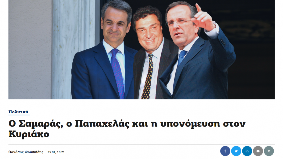 «O Σαμαράς, ο Παπαχελάς και η υπονόμευση στον Κυριάκο». Με αυτόν τον τίτλο κυκλοφορεί κείμενο στα «Παραπολιτικά», που σχολιάζει τη συνέντευξη Σαμαρά στην «Καθημερινή» που εκ των πραγμάτων δημιούργησε μεγάλο πρόβλημα στο εσωτερικό του κυβερνώντος κόμματος.