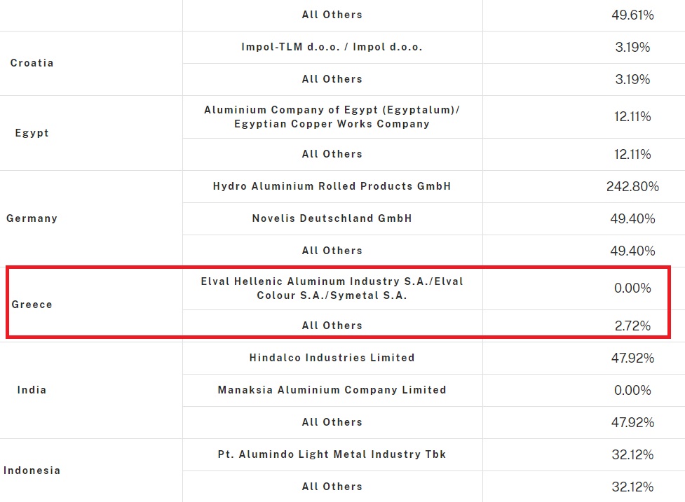 Το αμερικανικό υπουργείο Εμπορίου δημοσιοποίησε κατάλογο στον οποίο καταγράφονται οι δασμοί αντιντάμπινγκ και οι δασμοί εξαιτίας των κρατικών επιχορηγήσεων που επιβλήθηκαν (https://www.trade.gov/faq/final-determinations-antidumping-and-countervailing-duty-investigations-common-alloy-aluminum).