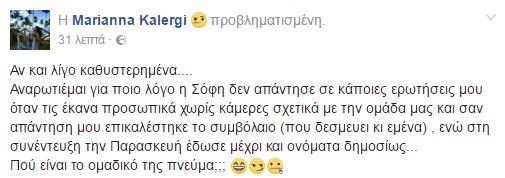 “Αν και λίγο καθυστερημένα…. Αναρωτιέμαι για ποιο λόγο η Σόφη δεν απάντησε σε κάποιες ερωτήσεις μου όταν τις έκανα προσωπικά χωρίς κάμερες σχετικά με την ομάδα μας και σαν απάντηση μου επικαλέστηκε το συμβόλαιο (που δεσμευει κι εμένα), ενώ στη συνέντευξη την Παρασκευή έδωσε μέχρι και ονόματα δημοσίως… Πού είναι το ομαδικό της πνεύμα;;;”