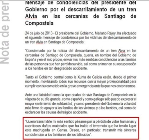 Έτσι μετά τις πρώτες παραγράφους όπου ο επικεφαλής της ισπανικής κυβέρνησης δηλώνει «συντετριμμένος από την είδηση του εκτροχιασμού τρένου στα προάστια του Σαντιάγο ντε Κομποστέλα» και αποστέλλει «θερμά συλλυπητήρια στις οικογένειες όσων έχασαν τη ζωή τους», περνά απότομα στον σεισμό που είχε σημειωθεί προσφάτως στην κινεζική επαρχία, και είχε ως αποτέλεσμα να χάσουν τη ζωή τους περί τους 100 ανθρώπους.