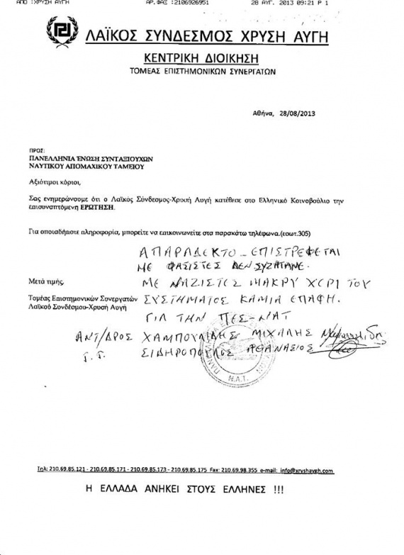 Με τον χαρακτηρισμό «Απαράδεκτο-Δε συζητάμε με φασίστες» επέστρεψε η Πανελλήνια Ένωση Συνταξιούχων του ΝΑΤ έγγραφο της Χρυσής Αυγής, με το οποίο τους ενημέρωνε ότι έχει καταθέσει ερώτηση στη Βουλή για θέμα που τους αφορούσε.