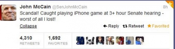 Η φωτογραφία φυσικά έκανε το γύρο του Twitter με αποτέλεσμα λίγο αργότερα ο Τζον ΜακKέιν, να μαζέψει τα ασυμμάζευτα γράφοντας (με σαφώς ειρωνικό τόνο) στο λογαριασμό του: «Σκάνδαλο! Πιάστηκα να παίζω παιχνίδι στο iphone κατά την τρίωρη συνεδρίαση της Γερουσίας – Και το χειρότερο από όλα: Έχασα!».