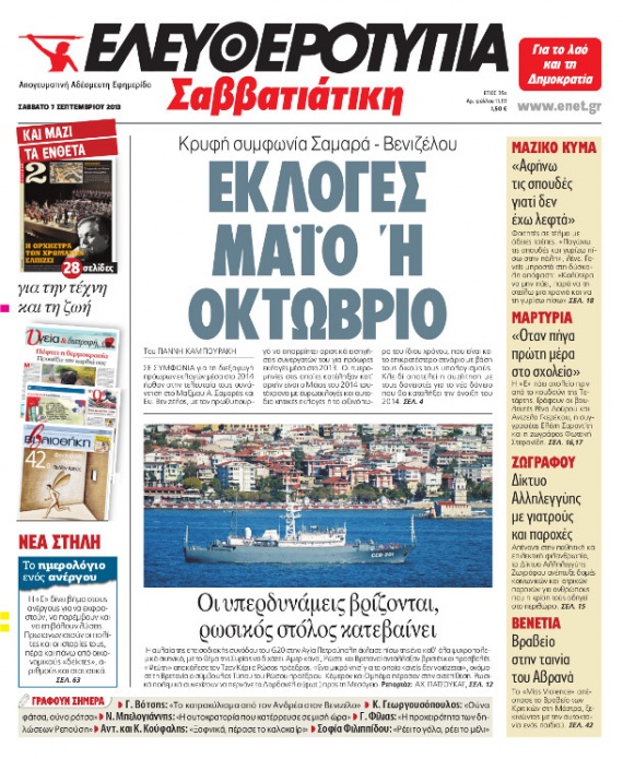 Σε μυστική συμφωνία για τη διεξαγωγή πρόωρων εκλογών μέσα στο 2014 κατέληξαν στην τελευταία τους συνάντηση ο πρωθυπουργός Αντώνης Σαμαράς και ο αντιπρόεδρος της κυβέρνησης και πρόεδρος του ΠΑΣΟΚ, Ευάγγελος Βενιζέλος σύμφωνα με την εφημερίδα "Ελευθεροτυπία".