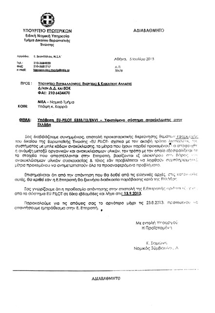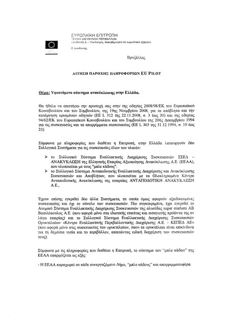 Με έγγραφό της η Γενική Διεύθυνση Περιβάλλοντος της Επιτροπής ζητά στο πλαίσιο του συστήματος EU PILOT συγκεκριμένες απαντήσεις για σειρά κρίσιμων ζητημάτων, όπως η ακριβής λειτουργία του συστήματος των μπλε κάδων, τα μέτρα που έχουν παρθεί προκειμένου να αποφευχθεί η ανάμειξη οργανικών και ανακυκλώσιμων υλικών, καθώς και τον τρόπο με τον οποίο εξασφαλίζεται ότι τα στοιχεία που αποστέλλονται στην Επιτροπή βασίζονται εξ ολοκλήρου στο βάρος των ανακυκλώσιμων υλικών συσκευασίας. Τα ερωτήματα που θέτει η Επιτροπή – όπως αποκαλύπτεται από τα σχετικά έγγραφα που απέστειλε – αποτυπώνουν κεντρικά προβλήματα στη λειτουργία και την αποτελεσματικότητα ουσιαστικά του μοναδικού συστήματος ανακύκλωσης που λειτουργεί στη χώρα, με απρόβλεπτες συνέπειες στην περίπτωση που οι απαντήσεις των αρμοδίων δεν ικανοποιήσουν τις Βρυξέλλες.