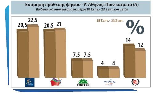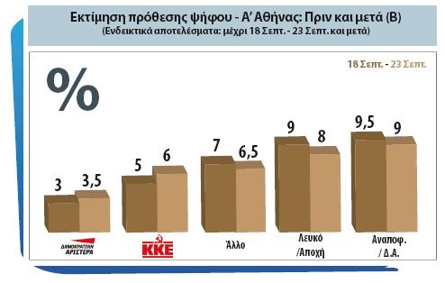 Η διερεύνηση της πρόθεσης ψήφου στην Α’ Αθήνας ξεκίνησε τη Δευτέρα 16 Σεπτεμβρίου. Η τραγική δολοφονία (τα μεσάνυχτα της Τρίτης) και οι εξελίξεις της επομένης που μονοπώλησαν το ενδιαφέρον, οδήγησαν (το μεσημέρι της Τετάρτης) στην απόφαση της προσωρινής διακοπής της συλλογής των στοιχείων. Η έρευνα συνεχίστηκε και ολοκληρώθηκε από τη Δευτέρα 23 Σεπτεμβρίου.