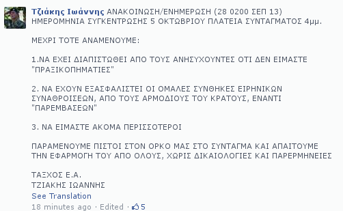 Σε ανάρτηση του στο facebook, ο διοικητής της ΚΕΕΔ Γιάννης Τζιάκης, ανακοίνωσε πως η συγκέντρωση των εφέδρων στην Πλατεία Συντάγματος μετατίθεται για τις 5 Οκτωβρίου στις 4 το απόγευμα.