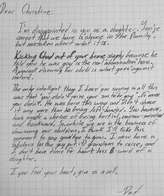 Το να διώξεις τον Τσαντ από το σπίτι σας, απλά επειδή σου είπε ότι ήταν γκέι είναι το πραγματικά «εξευτελιστικό» εδώ. Ένας γονέας να απαρνείται το παιδί είναι αυτό που πραγματικά «εναντιώνεται στην φύση».