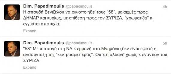 «"58":Με υποταγή στη ΝΔ κ εμμονή στο Μνημόνιο, δεν είναι εφικτή η ανασύνταξη της "κεντροαριστεράς". Ούτε η αλλαγή, χωρίς κ εναντίον του ΣΥΡΙΖΑ», έγραψε ο Δημήτρης Παπαδημούλης για να συμπληρώσει λίγο αργότερα: