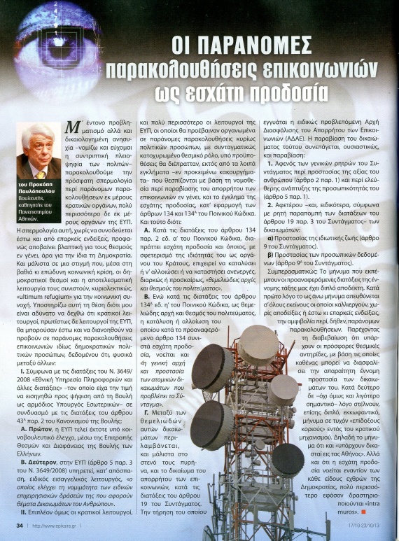 "Μ’ έντονο προβληματισμό αλλά και δικαιολογημένη ανησυχία –νομίζω και εύχομαι η συντριπτική πλειοψηφία των πολιτών- παρακολουθούμε την πρόσφατη σπερμολογία περί παράνομων παρακολουθήσεων εκ μέρους κρατικών οργάνων της ΕΥΠ".