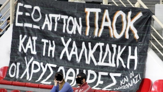 Σε προηγούμενο αγώνα οι οπαδοί του ΠΑΟΚ έχουν υψώσει πανό που γράφει: «Έξω από τον ΠΑΟΚ και τη Χαλκιδική οι Χρυσοθήρες και οι Νεοναζί». (Φωτογραφία από το paokmania.gr)