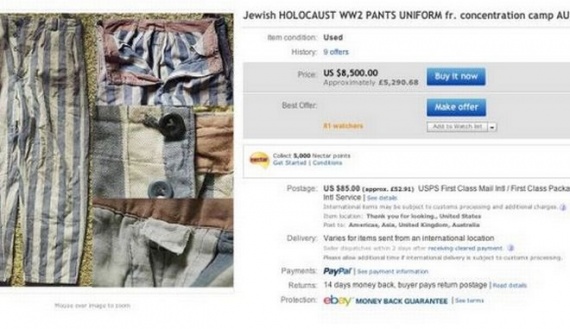 Η Mail on Sunday αναφέρει ότι οι δημοσιογράφοι της εντόπισαν την προηγούμενη εβδομάδα μια σειρά αντικειμένων από το Ολοκαύτωμα να βρίσκονται προς πώληση μέσω του eBay, ανάμεσά τους και μία ολόκληρη στολή που φορούσε στο Άουσβιτς ένας Πολωνός φούρναρης που έχασε τη ζωή του στο στρατόπεδο συγκέντρωσης, όπως τουλάχιστον ισχυριζόταν ο άνθρωπος που την είχε στην κατοχή του και την πωλούσε.